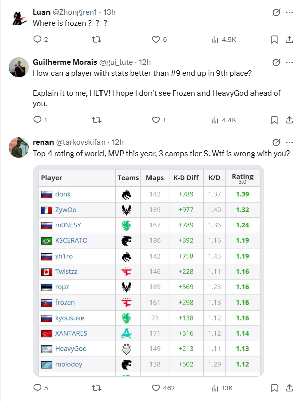 “一名数据比TOP9更好的选手,怎么会最终排在第9位?回答我,HLTV!真不希望看到frozen和HeavyGod排在KSCERATO前面。”