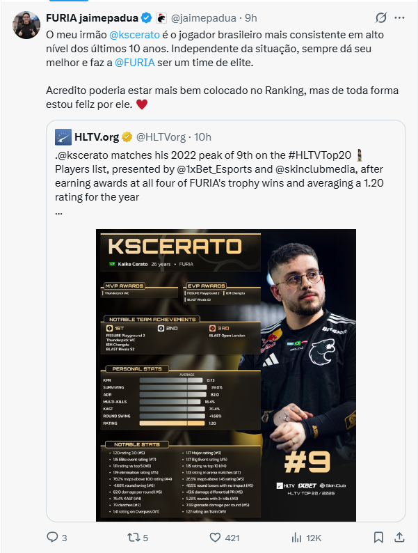 FURIA的创始人兼首席执行官 jaimepadua也对KSCERATO表达了祝贺:“我的兄弟KSCERTO是过去10年来在顶级赛事中表现最稳定的巴西选手。无论处于何种情况,他总是全力以赴,让FURIA成为一支顶尖战队。
