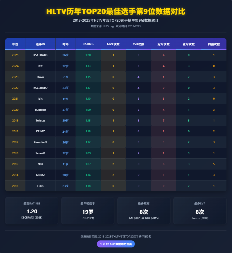 这是KSCERATO继2023年后再次跻身TOP20榜单,今年下半年,FURIA变为国际阵容后成绩斐然,一连四个冠军创造了队史纪录,也让队伍一跃成为世界第一,这其中KSCERATO的关键付出必不可少。那么,从2013年至今,历史上每年TOP20榜单第9位的选手们数据又是如何?
