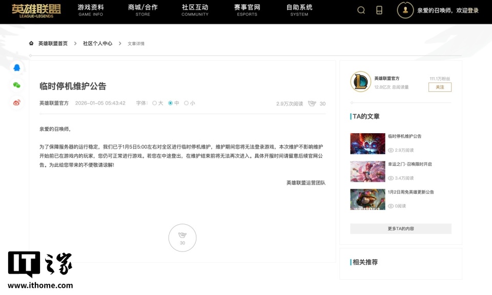 IT之家 1 月 5 日消息,据国服《英雄联盟》官网,《英雄联盟》于今天凌晨 5 点前后对全区进行临时停机维护,维护期间玩家将无法登录游戏,维护开始前已在游戏内的玩家,仍可正常进行游戏。若玩家在中途登出游戏,在维护结束前将无法再次进入。官方称,游戏重新开服时间请留意后续官网公告。