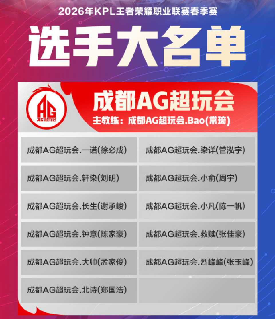 1月6日,参加2026年KPL春季赛的十八支战队,正式官宣了大名单。其中,大家关注的肯定是AG超玩会,狼队等强队。AG的大名单中,一诺,钟意,长生依旧还在。但是,一诺三人已经确定不参加比赛了,只是挂个名字而已!