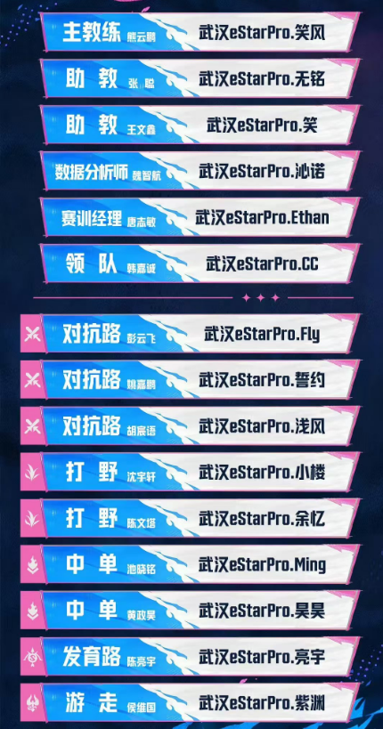 eStar的大名单最大的亮点,毫无疑问就是引入了fly。不一定能提升多大的实力,但起码eStar的比赛多了一些看点,这下是名副其实的十六冠王了,而且fly和誓约竞争,应该可以首发。其他四个位置应该是小楼,昊昊,亮宇和紫渊。看3组强大的战队们,只能委屈eStar进入B组了。