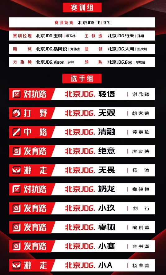 JDG大名单看着也比较丰富,不过替补的位置并不均匀。挑杯他们巅峰对决输给了RW侠,考虑到RW拿了亚军,这个结果也能接受。JDG的首发应该不会变,很可能和挑杯一样,实力应该在S组和A组之间,第一轮分组并不算太好,应该会进入A组。