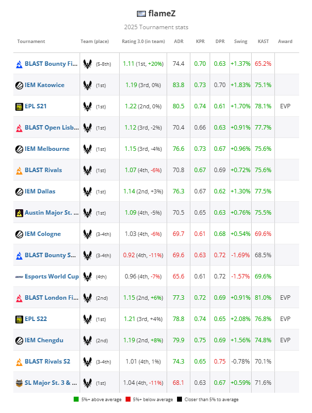 flameZ在本次演播室环境赛事中取得了1.22的平均rating,和新队友ropz并列队伍第二高,仅次于狙击手ZywOo的1.44 rating。凭借这一出色表现,flameZ获得了他2025年的第一个EVP奖项。