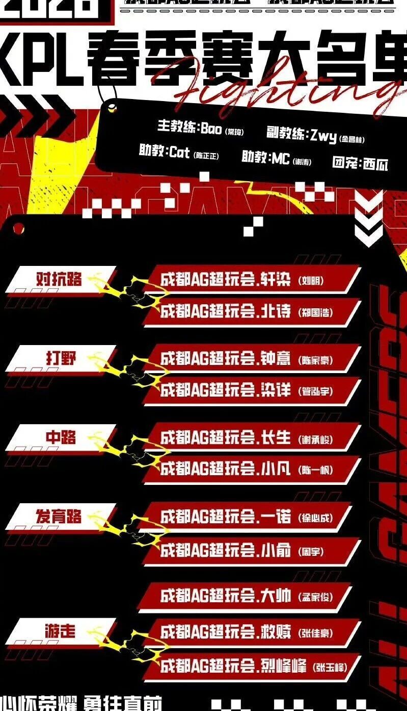 刚才AG公布了春季赛大名单,AG上至教练组下到首发五人组都有很大的变化,bao重回主教练位置,战文欲去到了副教练,奶茶则消失不见,猫神加入赛训组成助教。AG大名单高达十一人,轩染钟意长生一诺大帅都在,不过前期可能是轩染染详小凡小俞大帅这五人上场,钟意长生一诺这三人中途可能随时回归。