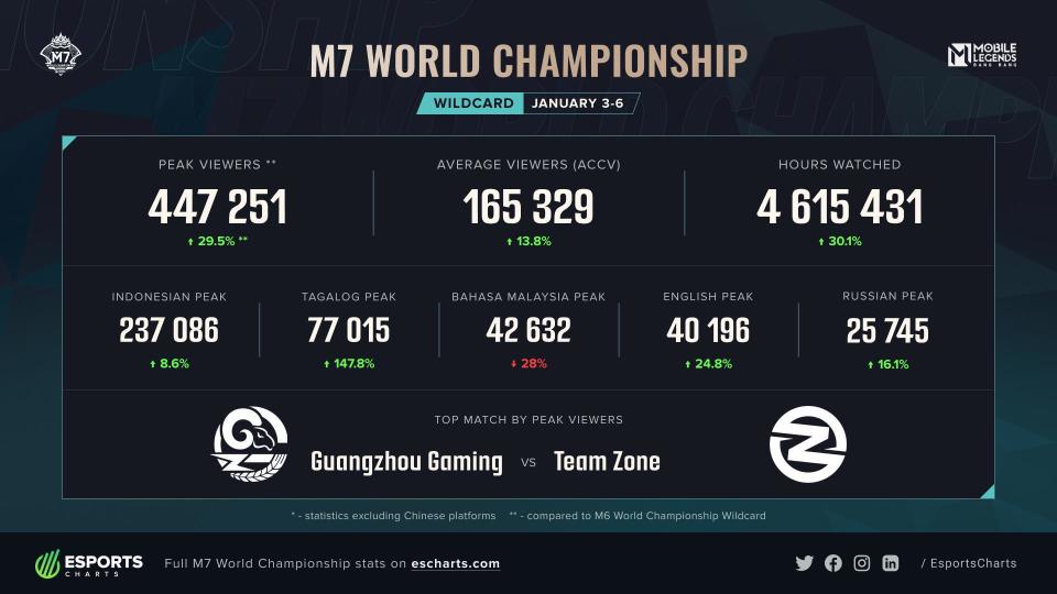 本次外卡赛中,在中国GZG(广州电竞队)与蒙古T1战队的决胜轮中,GZG2比3不敌Z1遗憾出局,未能与另一支中国战队DFYG会师正赛。该场比赛峰值在线观看人数突破44.7万,创下M赛外卡赛新高。作为正赛中国赛区的独苗,DFYG将在揭幕战中迎战世界劲旅Team Falcons。