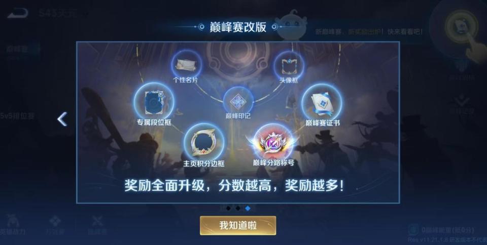 根据目前已经曝光的信息来看,奖励内容将包含:“巅峰证书、个人主页内的巅峰徽章、个人主页中的巅峰积分边框、巅峰段位框”等,整体内容还是非常丰富的。