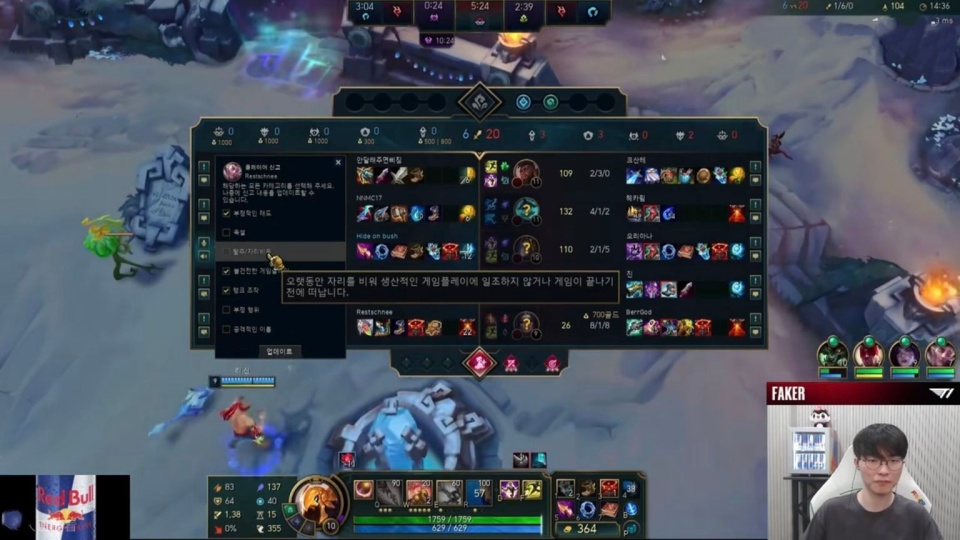 Faker当场开始吐槽:我明明确定,他就在我身后,但他却没有掩护我,这波之后,Faker化身“峡谷警察”,开始切屏盯着Feather,没隔多久老李就逮到,Feather在上路塔下挂机一直没动,老李果断打开了举报面板,把态度恶劣、违反体育道德、恶意刷屏、滥用信号,全部都勾选了一遍。