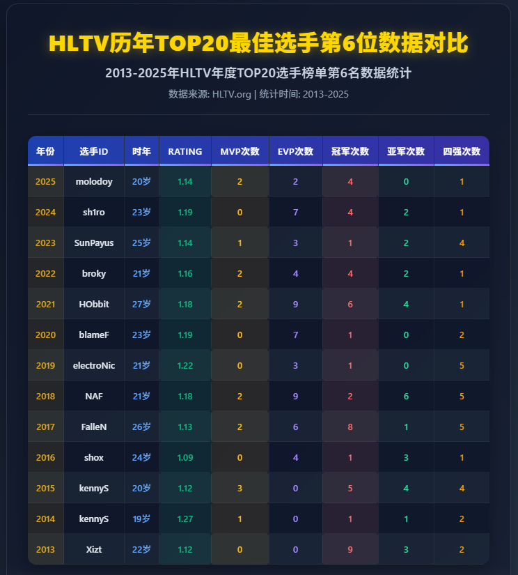 “HeavyGod以1.12 rating和1次MVP未进TOP20,molodoy以1.12 rating和2次MVP却排名第6(基于2025年大型赛事对阵TOP20战队的筛选数据)。这很符合HLTV的评选逻辑。”