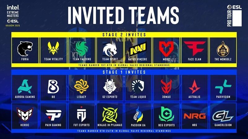 随着全部24支符合条件的战队确认接受邀请,ESL现已正式公布首届IEM克拉科夫的参赛队伍名单。这项赛事将成为2026年首项超级精英赛事,接替原有的IEM卡托维兹。