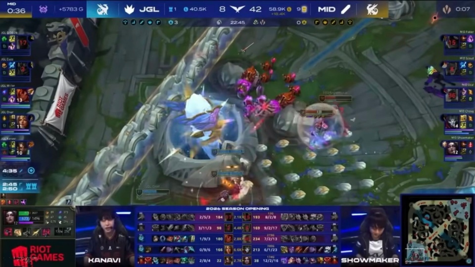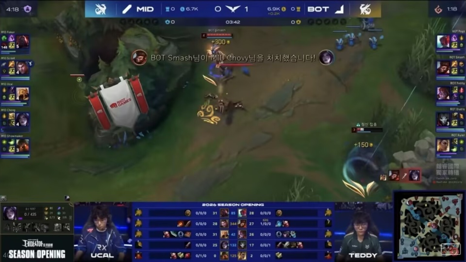 最后一把是中单打AD,这把Chovy被针对惨了,Smash住在下路,开局3分钟就抓死双人组,不过后续的Gank被反蹲了,大超卡莎连拿2个头,扳回前期劣势,打到中期,中单队依旧落后,16分钟人头比13:6,AD队经济领先3.6K,但Chovy这把太猛了,团战疯狂操作,直接带队翻盘了。