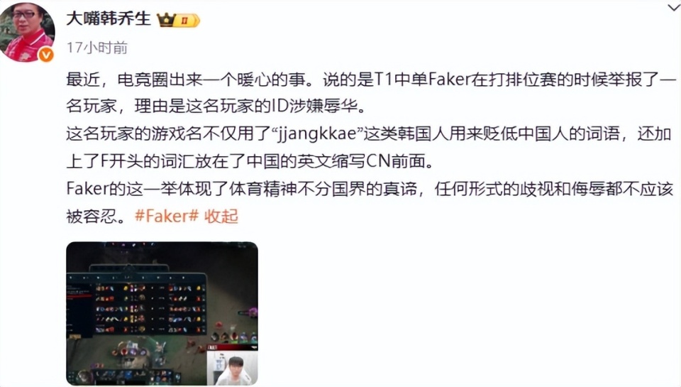 Faker成正义化身,举报韩服辱华ID,获央视主持人盛赞