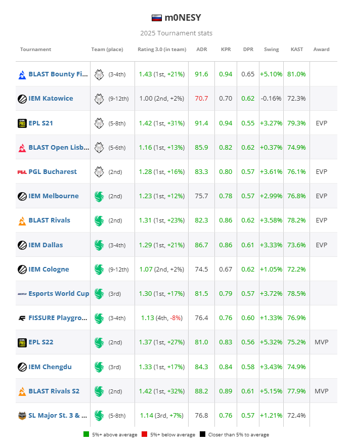 G2在紧随其后的IEM卡托维兹迎来了一记当头棒喝:在接连负于Virtus.pro与FaZe过后,队伍最终以9-12名的成绩草草出局。m0NESY在小组赛中遭遇了Falcons——这是他与NiKo分道扬镳后的首次正面交锋;在获胜的地图中,m0NESY的表现尚且稳健,同时在与FaZe交手的胜利地图中也是如此。但他在其余地图中的低迷发挥将自己的赛事平均Rating拖到了1.00,这也使得IEM卡托维兹成为了他在2025全年中,表现最低迷的一项赛事。