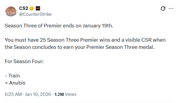 Valve发布动态宣布当前优先赛季将于1月19日(非北京时间)结束。同时,Anubis将在第四赛季取代Train加入图池。