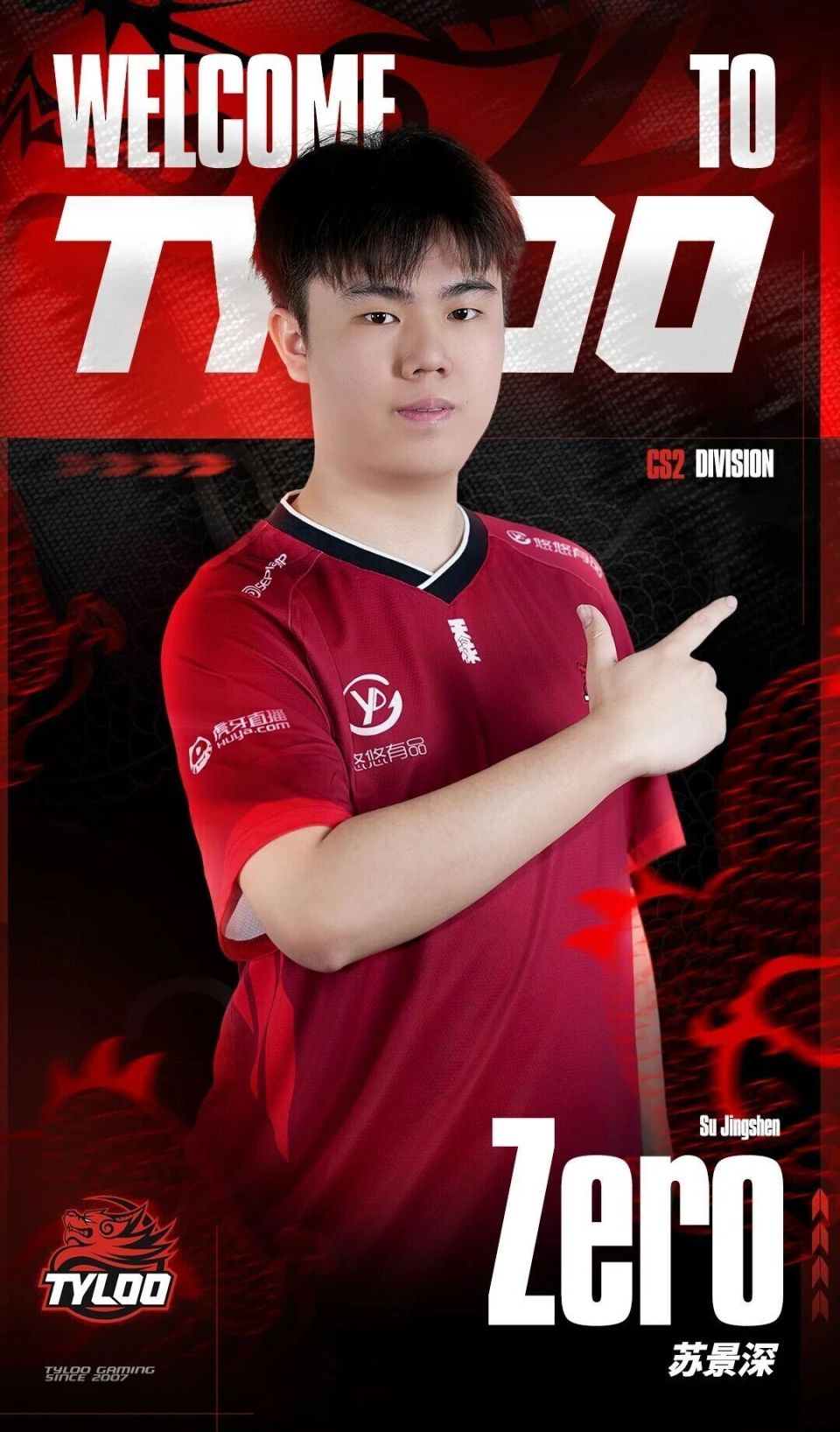 “我们很高兴地宣布,CS2职业选手Zero(苏景深)即日起正式加入杭州西湖 TYLOO 电子竞技俱乐部,成为 CS2 分部的一员。