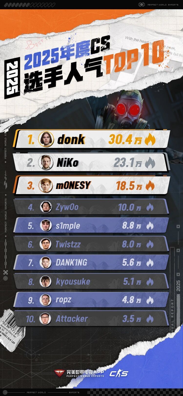 ZywOo成CS历史上首位四度获得年度TOP1选手!donk以史上最强基础数据列次席