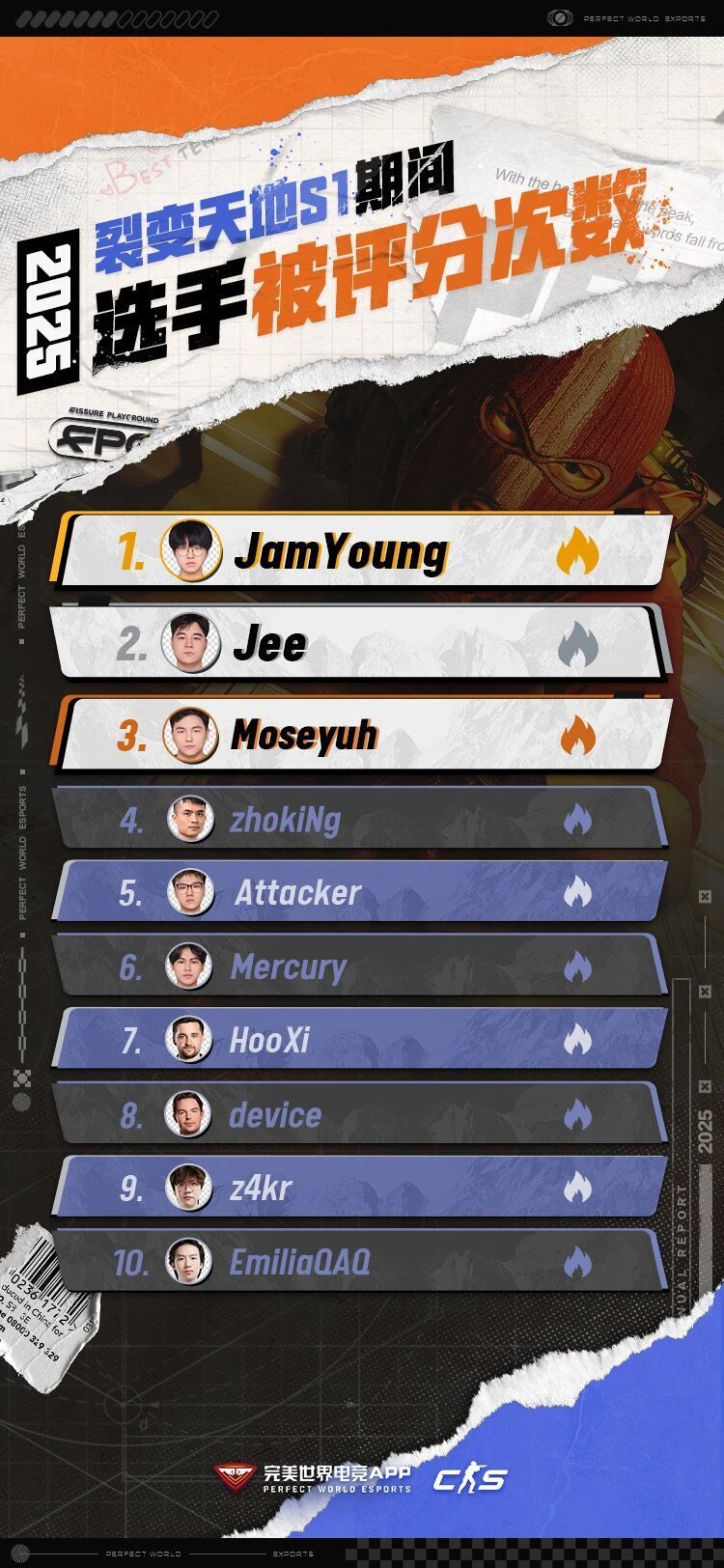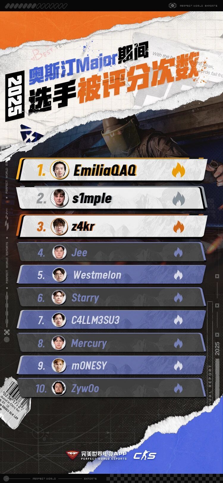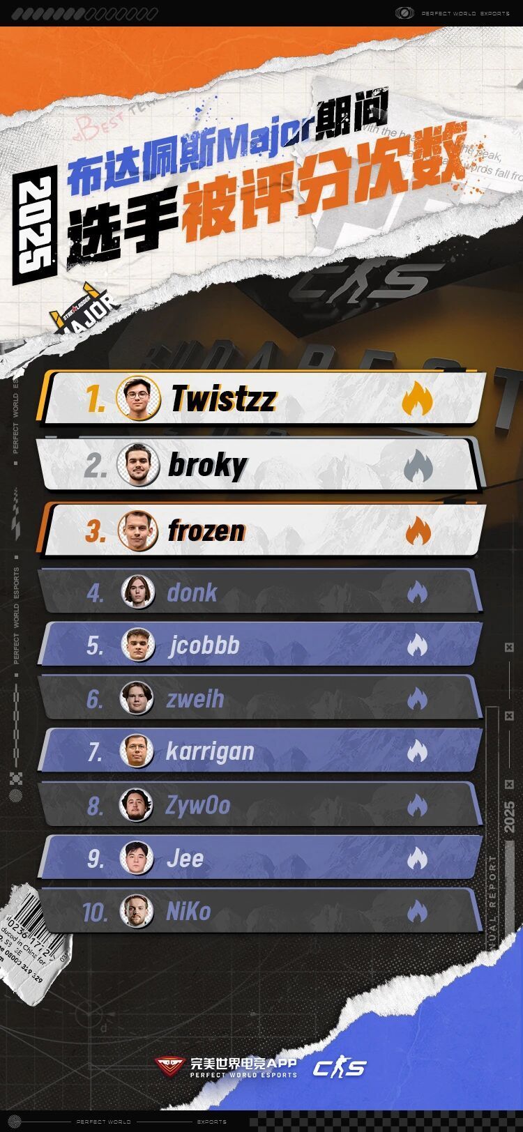 与此同时,我们也整理了裂变天地S1、CAC 2025、奥斯汀Major与布达佩斯Major时期,选手的被评分次数榜单。快来看看你当时的都给哪些选手打了分?