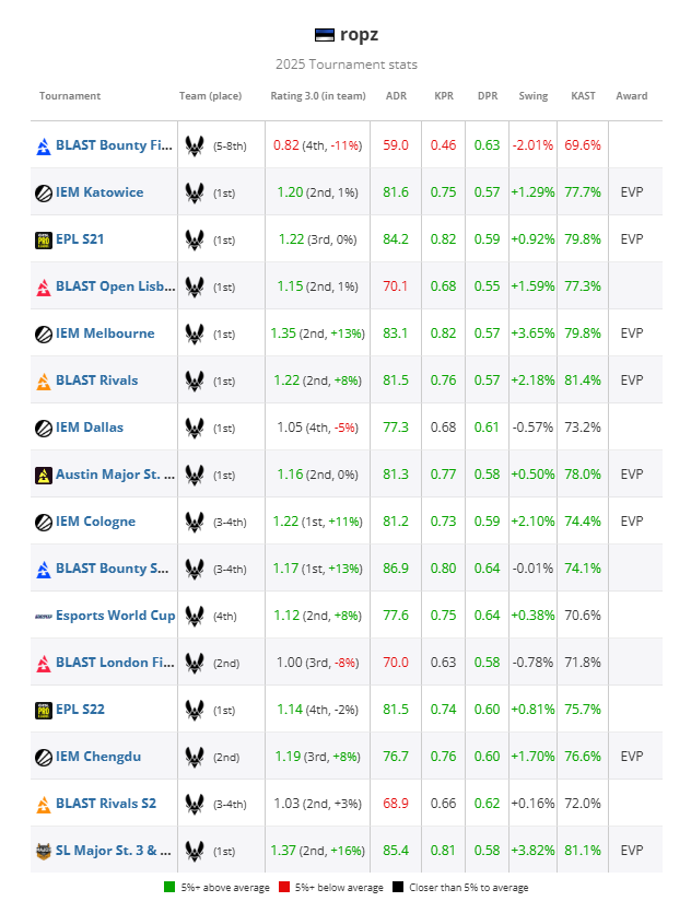 虽然他最终未能获得MVP,但他在IEM墨尔本和布达佩斯Major的巅峰表现足以媲美众多选手在2025年的MVP头衔。布达佩斯Major的竞争尤为激烈,考虑到赛事重要性,ropz的表现或许是除了前两名选手之外,全年其他选手的最佳表现。
