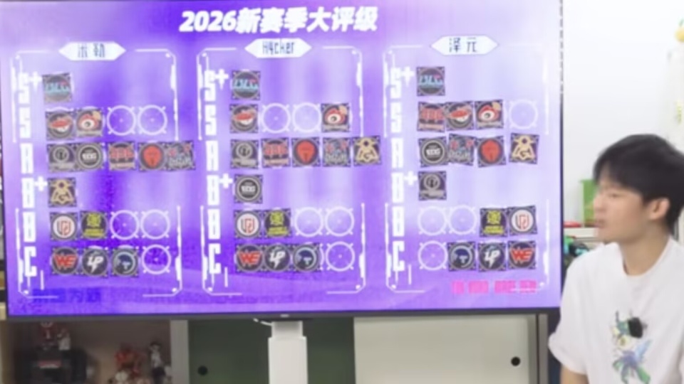 剩下的队伍,AL和WBG,三人给到的都是S,管泽元的S列表,多一个JDG,他觉得京东是有潜力的,大校个人很看好HongQ,再往后的话是A级,三个人给的队伍都差不太多,有EDG、IG、TES、LNG、OMG,再剩下的队伍就没啥好说的了,基本上都在摆烂,他们给的都是最低评级。