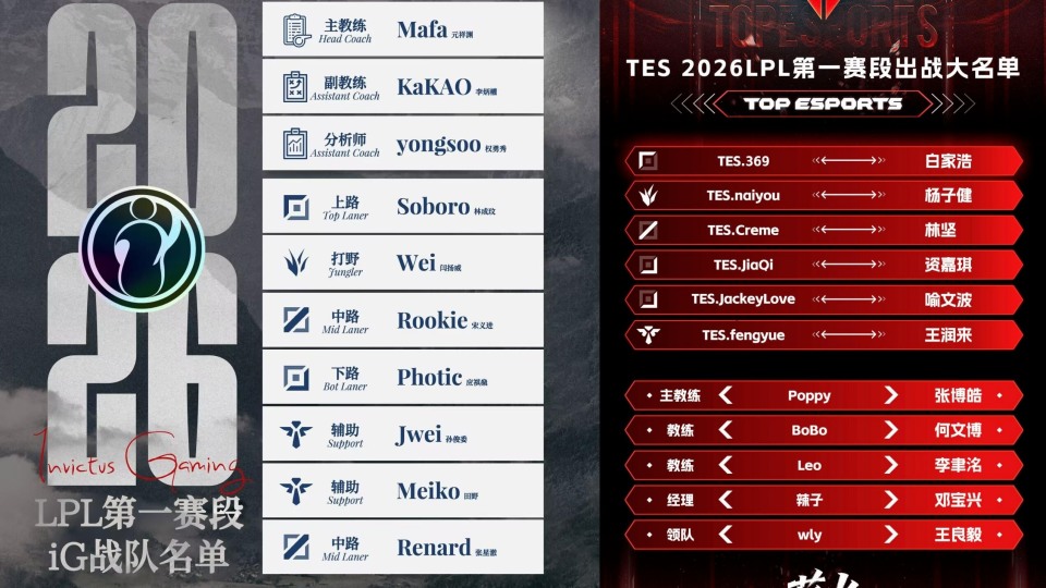 LPL新赛季第一赛段,再有2天就正式开赛了,打揭幕战的四支队伍,已经陆续官宣大名单了,IG阵容跟之前网传的一样,Rookie回归顶替Renard,这位德杯还算亮眼的小将,还真只是打一打德杯,不过IG新赛季大名单里,Renard也是在的,如果Rookie状态拉胯的话,他还有机会打首发。