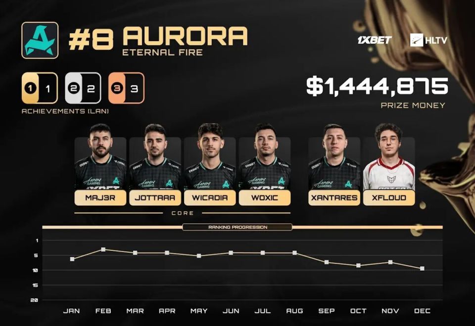 进入赛季的后半段,Aurora的表现开始变得飘忽不定:高光更亮眼,低谷也更扎眼。在EPL无缘淘汰赛、未能晋级StarLadder布达佩斯Major的第三阶段都是令人失望的结果。不过,他们也在电竞世界杯中斩获了亚军,并在PGL布加勒斯特大师赛中终结了长期以来的线下冠军荒;这两项重要的成就最终帮助他们锁定了年度第八的位置。