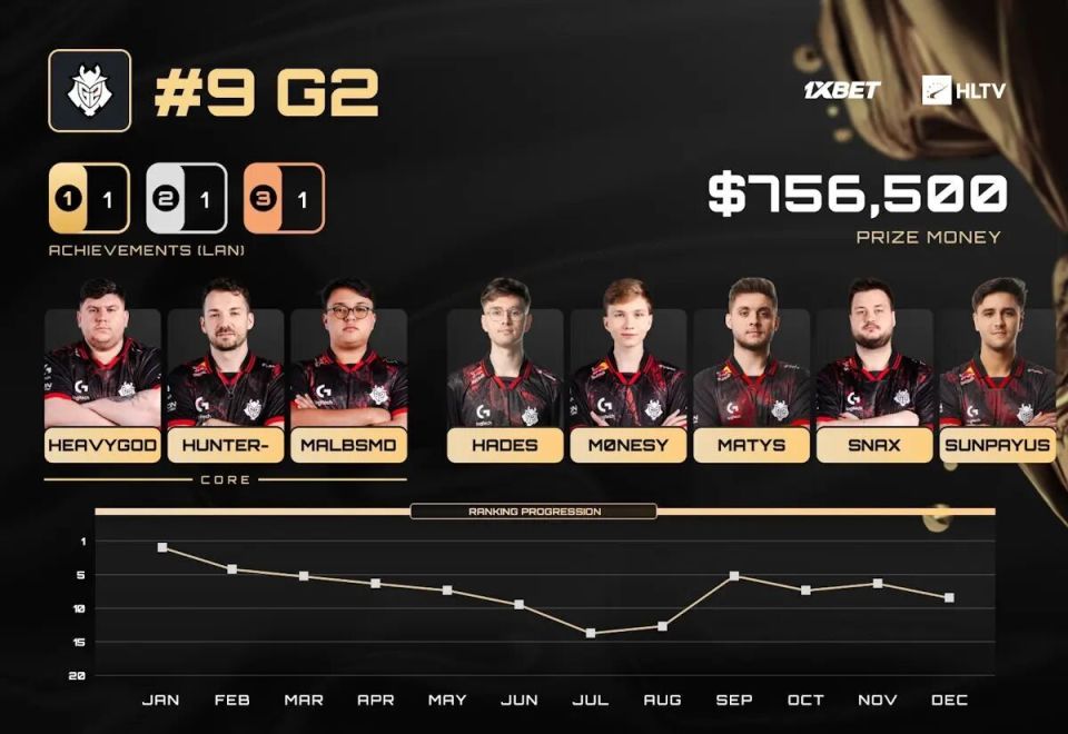 然而,G2并未能长期维持这一高度。他们在与Vitality、FURIA等世界顶级强队的对抗中屡屡告负,也在多项赛事中与淘汰赛的资格失之交臂,其中就包括StarLadder布达佩斯Major。即便如此,在伦敦所展现出的巅峰状态仍然足以帮助他们在这份榜单中占据第九的位置。