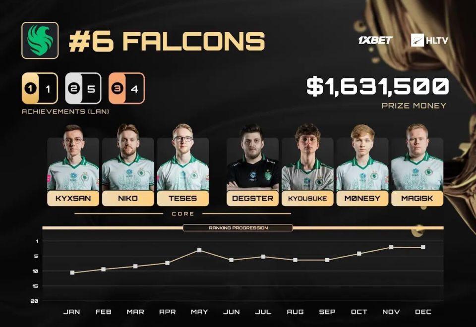 在休赛期,Falcons又迎来了进一步的补强——kyousuke。尽管他们在IEM科隆的开局略显动荡,但很快便稳稳扎根于世界前五强队之列,连续五项赛事至少打入四强。与此同时,Falcons还成功晋级StarLadder布达佩斯Major的决胜赛,这也是他们在Major中为最出色的一次表现,为这一年画上了积极的句号。