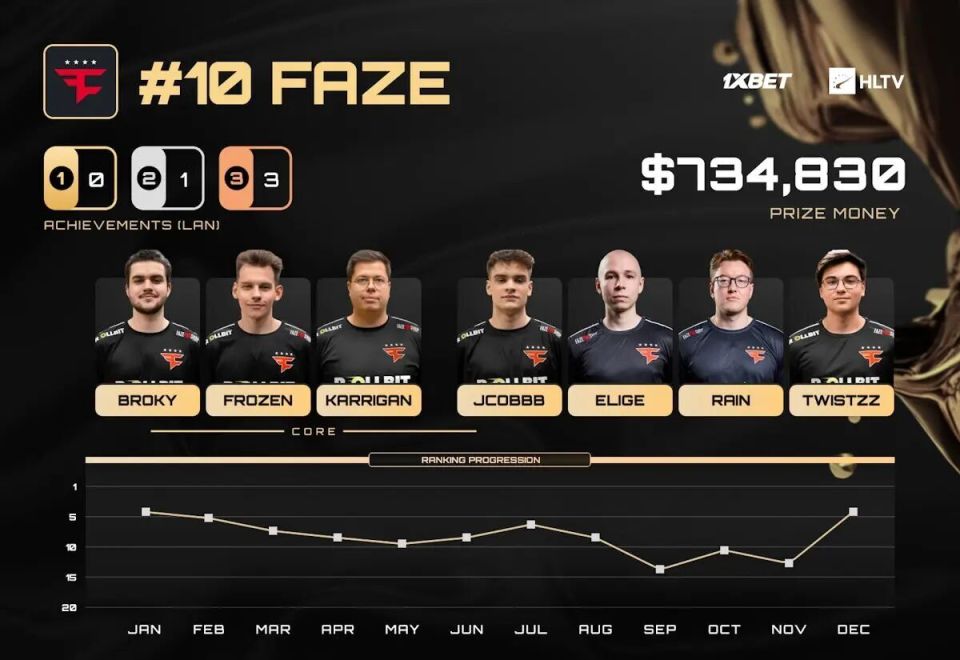 而正是在这次Major的深度征程,最终坐实了FaZe跻身年度TOP10战队的地位。若非BLAST奥斯汀Major的成绩没有被计入本次排名(因为当时的核心阵容中并不同时包含broky、karrigan与frozen,只有后两人),他们原本甚至有机会排在第九。