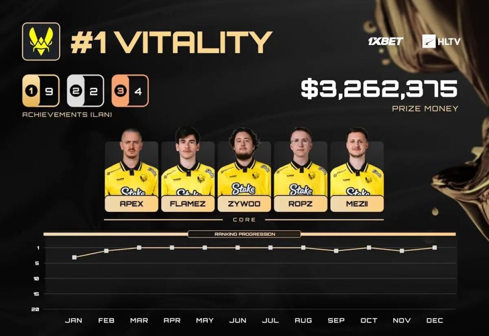 对于那些怀疑2025年归属的人,Vitality在StarLadder布达佩斯Major上用最有力的方式宣告了自己的地位:他们一路高歌猛进,仅丢掉了两张地图就实现了Major连冠。这一壮举自2019年定义了时代的Astralis以来,就从未有人能够再次做到。在2025年参加了的16项大赛中,Vitality九次夺冠,其中含有全部两届Major,同时仅有一次未能进入前四。他们作为年度最佳战队的地位,毫无争议。