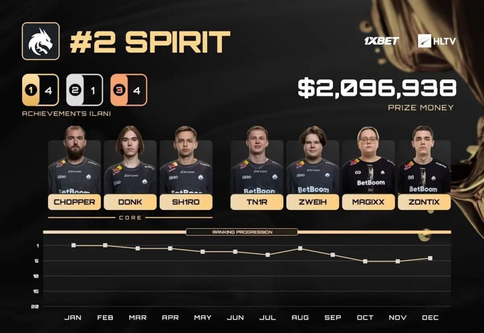 因此,Spirit在状态并不理想的情况下踏上了StarLadder布达佩斯Major的赛场。但随后,他们用行动打消了所有的疑虑:小组赛阶段击败MOUZ轻松突围,一路挺进半决赛。尽管最终又一次让Vitality终结了他们的征程,但这次Major四强的成绩,为Spirit在整体上极为成功的一年画上了句点——已有四冠在手,他们毫无争议地坐稳了2025年第二强队的位置。