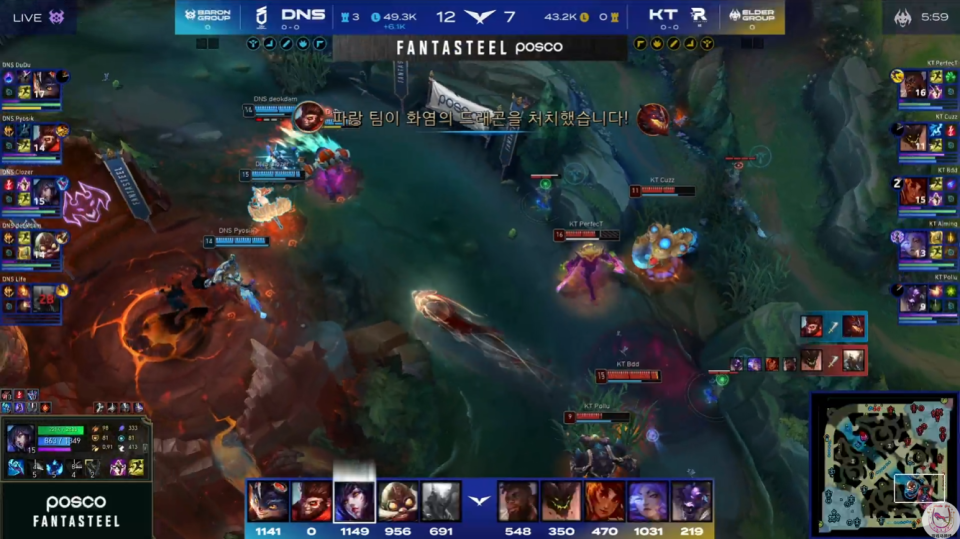 优势局DNS大龙逼团,KT打野石头人和开团的牛头率先被秒,随后ADC也被击杀,DNS轻松拿下大龙锁定胜局。