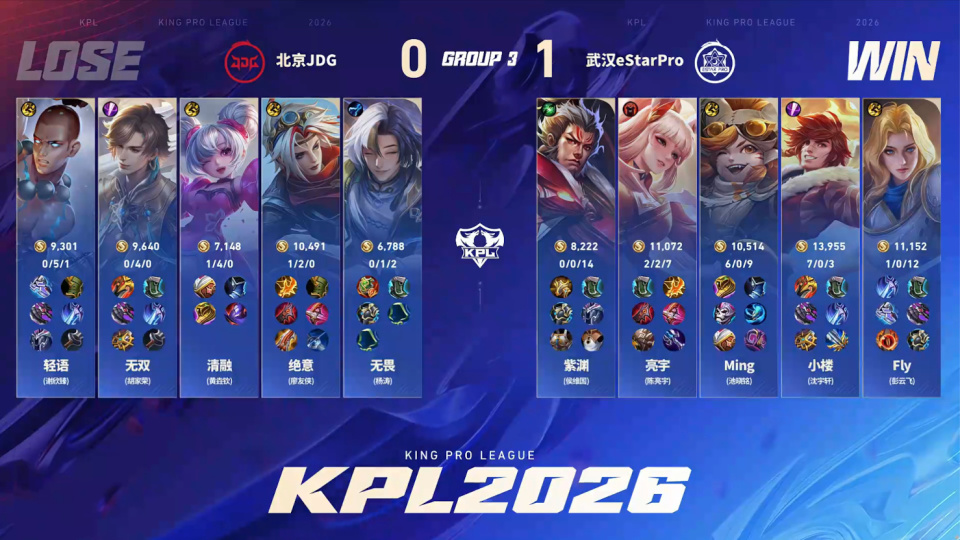 今日首战,来自北京的JDG战队对战到了武汉eStar, 其中ES战队可是转会期的焦点,这支队伍在转会期快到结尾的时候,选择签约“KPL对抗路最高的山”,那就是对抗路选手飞牛。下面就来聊聊看,在这场首秀中,两队选手的表现如何。