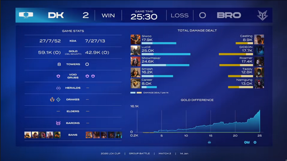 第一局比赛,DK蓝色方,禁用:沙皇、杰斯、发条、鳄鱼、卡莎,选用:Siwoo安蓓萨、Lucid皇子、ShowMaker瑞兹、Smash伊泽瑞尔、Career卡尔玛;BRO红色方,禁用:奇亚娜、石头人、兰博、巴德、卢锡安,选用:Casting雷克塞、GIDEON赵信、Roamer岩雀、Teddy芸阿娜、Namgung妮蔻
