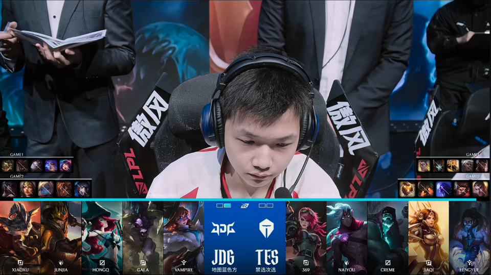 第一局比赛,JDG蓝色方,禁用:兰博;杰斯;阿卡丽;巴德;牛头,选用:Xiaoxu鳄鱼;JunJia石头人;HongQ发条;GALA芸阿娜;Vampire妮蔻;TES红色方,禁用:波比;瑞兹;奇亚娜;卡莎;亚恒,选用:369奎桑提;naiyou狼母;Creme沙皇;JiaQi烬;Fengyue芮尔