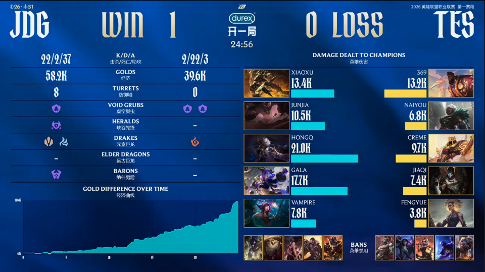 结果不得不说,没有了哥哥的TES,完全就是一盘散沙,被JDG打成了单方面的碾压局。3分钟左右,JunJia石头人率先被秒,但随后JDG下路双人组大胆操作完成0换2;8分钟左右,JunJia石头人果断闪现大招,Creme反应不及遭到击杀;12分钟左右,JDG下路抓住机会线杀JiaQi,随后Fengyue同样被集火击杀;19分钟左右,JDG野辅强硬开团击杀Creme,JDG十九分钟经济领先一万;20分钟左右,Xiaoxu鳄鱼凭借经济优势轻松单杀369;22分钟左右,HongQ发条单杀naiyou狼母,JDG团战全面碾压拿下大龙;最终24分56秒,JDG团灭TES,先赢一局!