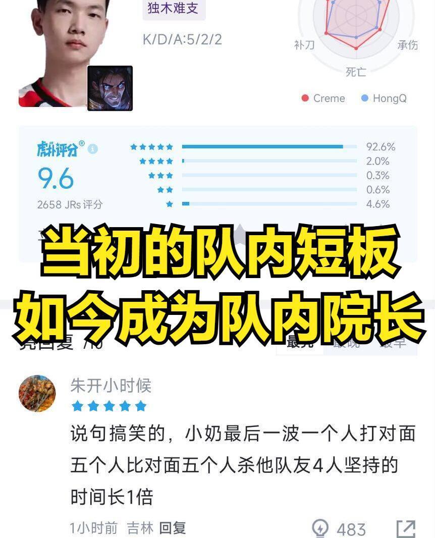 而在这场BO3当中,TES最尽力的选手竟然是中单小奶油,尤其是TES跟JDG的第二场比赛当中,小奶油死一次就直接掉高地和大龙。而小奶油在团战期间一打五的画面,也让很多TES粉丝感到泪目。不少JKL粉丝在看见TES这种发挥后,也是希望TES未来能够补强一下辅助和打野,毕竟单纯看比赛,就能够发现打野和辅助根本不是LPL级别的选手,而上单369也是对线偏混。