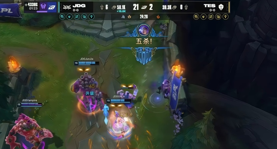 对阵JDG的第一局比赛,TES五个位置全面溃败,被对手打出22-2的夸张人机比分,比赛中不以对线和线杀见长的GALA完成线杀,更是在后期一波砍下五杀终结比赛。