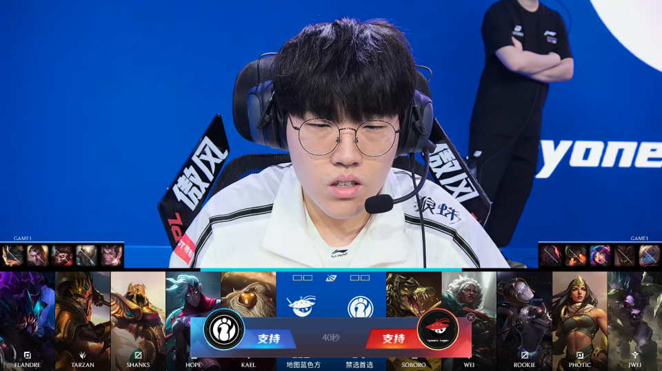第一局比赛,AL蓝色方,禁用:兰博;杰斯;猴子;潘森;赵信,选用:Flandre雷克赛;Tarzan皇子;Shanks沙皇;Hope韦鲁斯;Kael巴德;IG红色方,禁用:波比;石头人;妮蔻;泰坦;塞恩,选用:Soboro鳄鱼;Wei狼母;Rookie发条;Photic希维尔;Jwei牛头