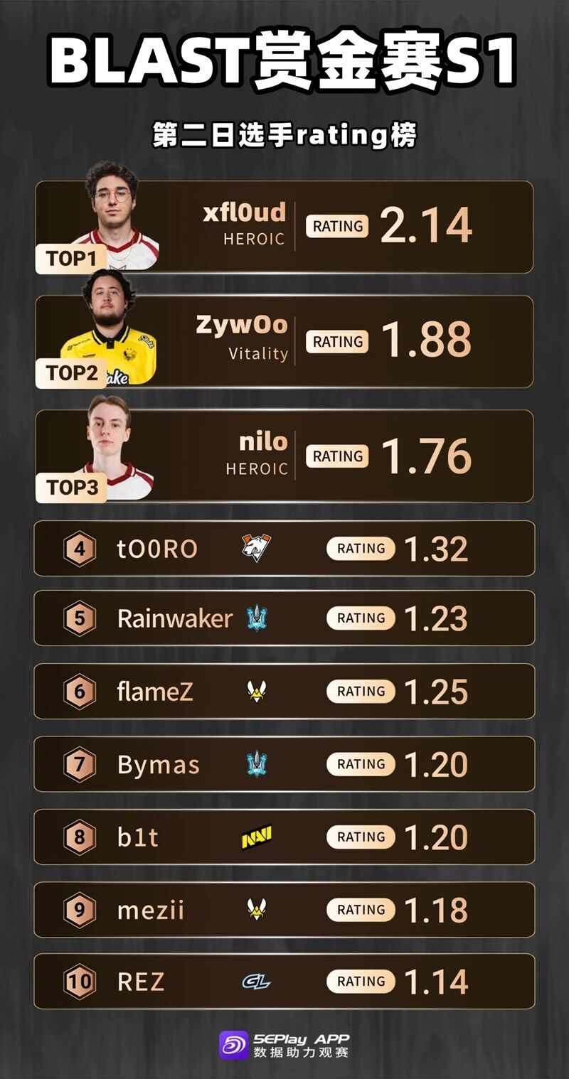 来自Heroic的xfl0ud和nilo以位列榜单的1、3名,昨日Heroic以两场碾压比分送走了对手,图一Nuke上nilo甚至打出了2.56的rating。排名第二的是去年的TOP1选手ZywOo,薯薯也是在昨日对阵Virtus.pro的比赛中发大力,看来休赛期没有影响ZywOo的手感。
