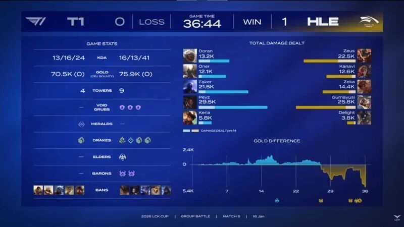 结果第一局比赛,双方各打了半场好局,HLE凭借Gumayusi的超神发挥,笑到了最后。比赛前期,T1多次针对上路,开场12分钟,抓死四次Zeus;比赛第26分钟左右,Kanavi蔚先手强开Peyz卢锡安,Gumayusi飞机三杀帮助HLE打出1换4大胜拿下大龙;比赛第29分钟左右,Faker面对HLE全队追击反手单杀Zeka岩雀;最终36分44秒,HLE团灭T1,先赢一局!