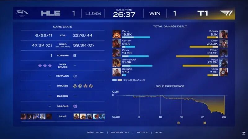 第一局比赛,T1蓝色方,禁用:杰斯、沙皇、韦鲁斯、芮尔、泰坦,选用:Doran安蓓萨、Oner潘森、Faker瑞兹、Peyz卢锡安、Keria米利欧;HLE红色方,禁用:石头人、发条、芸阿娜、巴德、厄斐琉斯,选用:Zeus兰博、Kanavi蔚、Zeka岩雀、Gumayusi飞机、Delight牛头