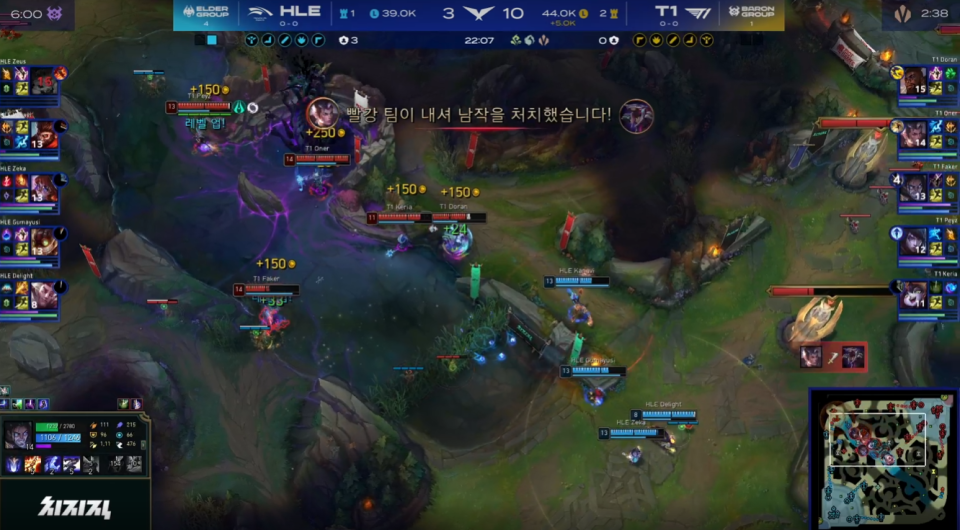 Kanavi猴子河道遇到Oner的赵信,其实打一下也就行了,结果非要追着弄。然后Faker靠过来,Zeka也被逼要靠过来,前期兔子和塞拉斯的战斗力自然是后者更强。随后辅助也赶来,双方原本都要拉开的时候,Kanavi 的猴子强行闪现想要去杀Oner的赵信,结果反送给了Faker双杀!后面?后面比赛就结束了。