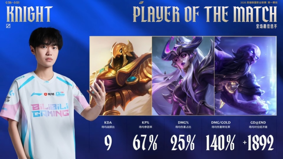 两场比赛结束之后,获得全场MVP的选手都是中单,Knight和Rookie也成为了昨天比赛的主角,当然在两个选手之外,队友的发挥也不应该被忽视,Bin三局对线打圣枪哥优势都很大,他的状态复苏对BLG来说还是相当重要的。