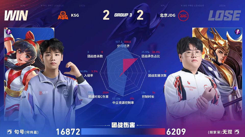 3比2,在句号超神的数据下,KSG又一次战胜了JDG!离开JDG之后,句号面对老东家保持了全胜。面对曾经差点耽误了自己的JDG,只要一打JDG,句号就能超常发挥!拿下JDG之后,KSG顶端小组第一!