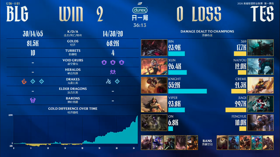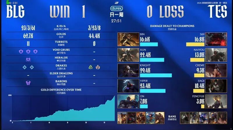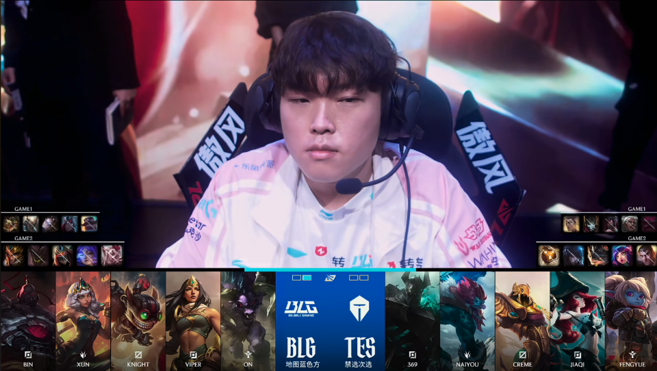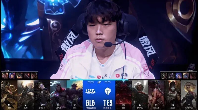 第一局比赛,BLG蓝色方,禁用:杰斯;妮蔻;兰博;塞恩;奎桑提,选用:Bin鳄鱼;Xun潘森;Knight发条;Viper韦鲁斯;ON布隆;TES红色方,禁用:石头人;波比;芸阿娜;牛头;烈娜塔,选用:369奥恩;naiyou狼母;Creme阿卡丽;JiaQi烬;Fengyue芮尔