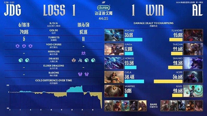 首局Junjia在河道带起节奏拿到一血,第一条大龙刷新的团战,Gala的厄斐琉斯拿下三杀团灭AL,随后JDG凭借经济优势顺利结束比赛。