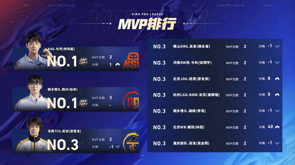 KSG句号 (何伟嘉)桐乡情久-陌冷 (徐舟)累计获得3次MVP,并列MVP排行榜首。