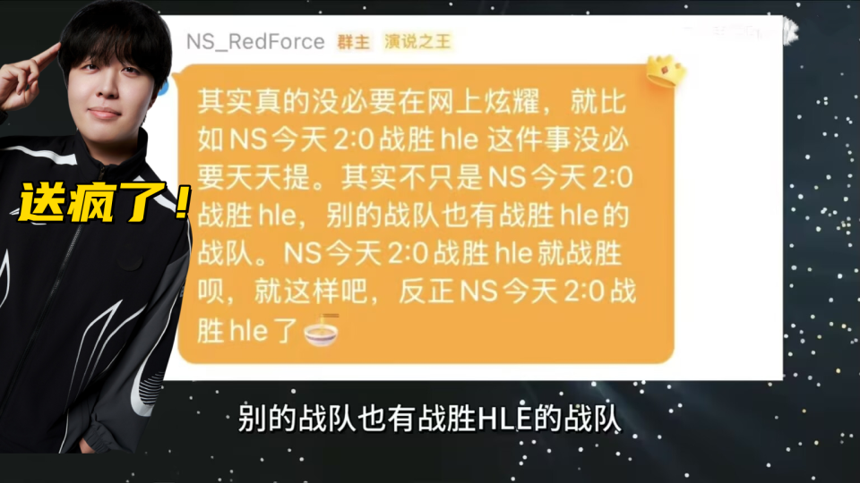比赛结束之后,NS在粉丝群发文:真的没必要在网上炫耀,就比如NS今天,2:0战胜HLE,这件事就没必要天天提,后续NS反复强调2:0,不到100字的内容,说了4次2:0赢HLE,生怕别人不知道,有意思的是,现NS主教练Dandy,去年在HLE效力,这波带队以弱胜强,够吹一段时间了。