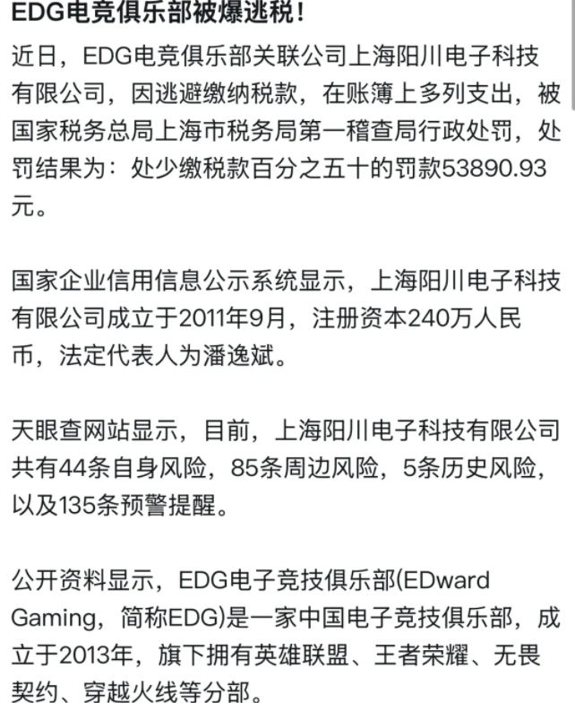 因此,当战绩没有明显起色时,外界的耐心自然也在被不断消耗,而这次税务问题的曝光,则让EDG的处境雪上加霜,根据公示信息,关联公司因在账目中违规列支被处罚,罚款金额虽然不算巨大,但“偷税漏税”四个字本身就极具杀伤力。