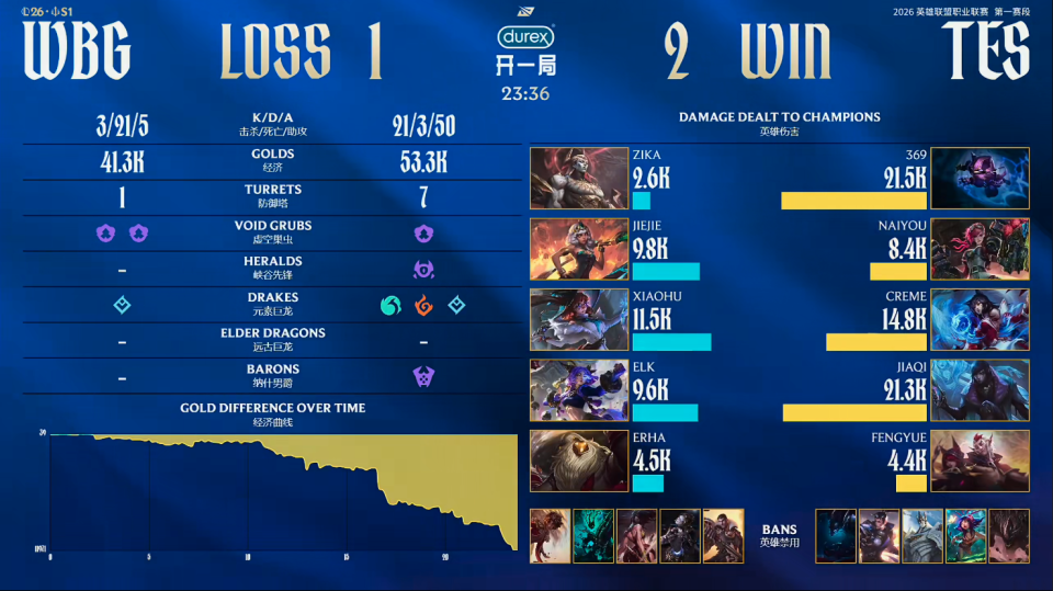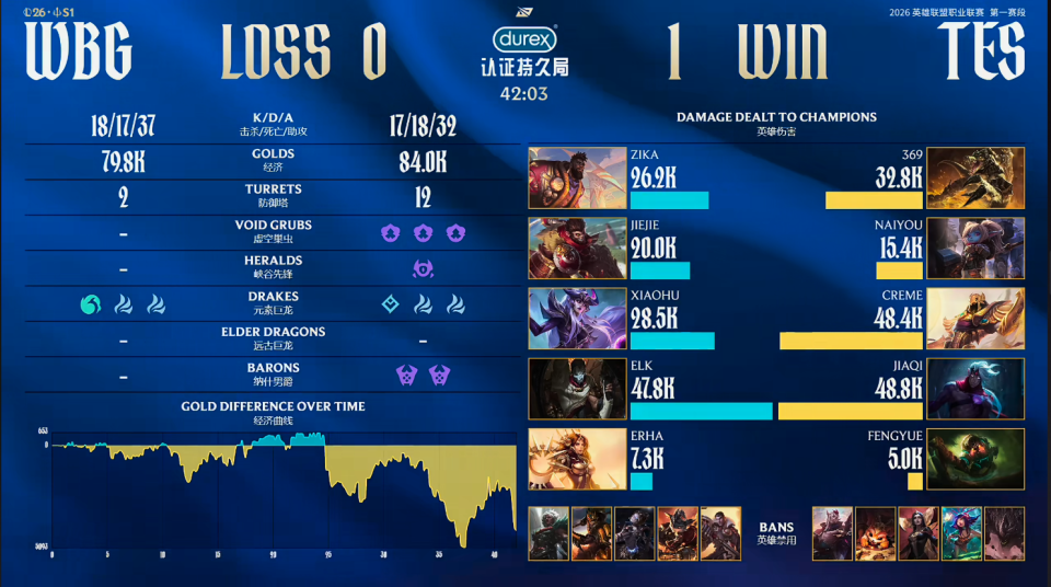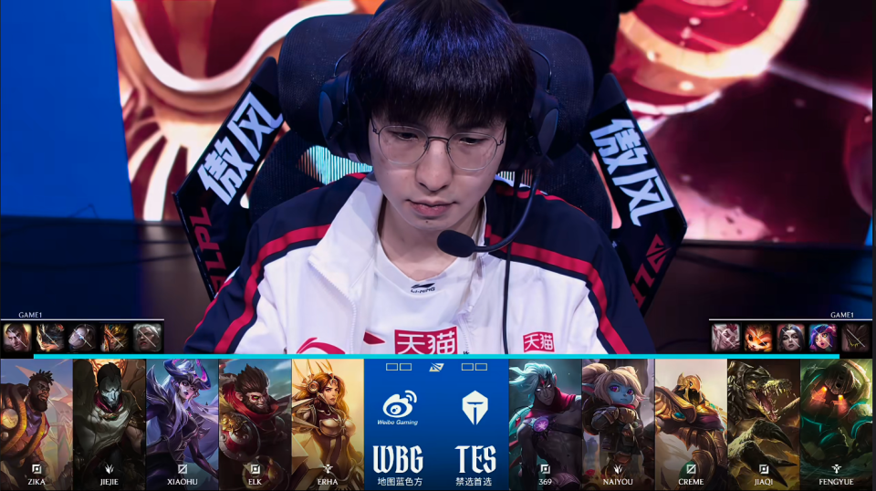 第一局比赛,WBG蓝色方,禁用:杰斯;兰博;发条;皇子;狼母,选用:Zika奎桑提;Jiejie猴子;Xiaohu辛德拉;Elk烬;Erha蕾欧娜;TES红色方,禁用:石头人;妮蔻;妖姬;纳尔;洛,选用:369鳄鱼;naiyou波比;Creme沙皇;JiaQi韦鲁斯;Fengyue泰坦